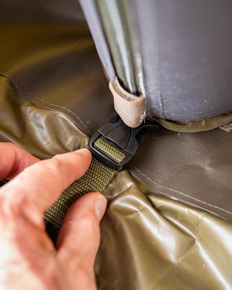- Zadní panel na zip umožňuje zadní vstup nebo prodloužení bivaku/deštníku.