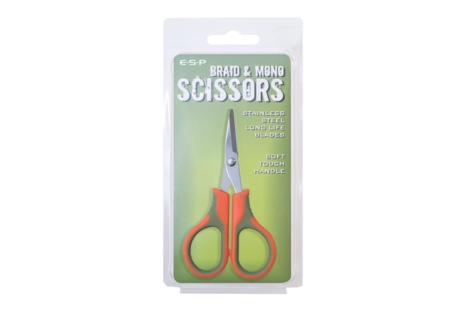 Značkové oranžové nůžky ESP, ideální pro stříhání většiny nití, pletenek nebo vlasců, zejména pro kaprařinu.