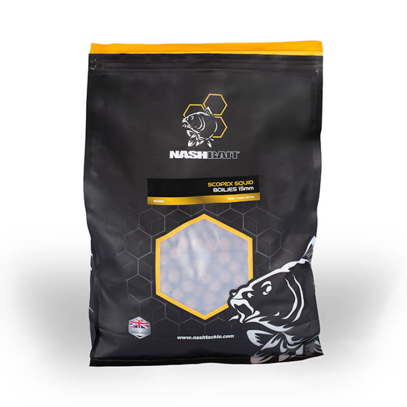 1 kilogramový sáček boilies značky Nash příchuť Scopex Squid na adrese Barva přírodní z 15 milimetrů, zejména pro lov kaprů.