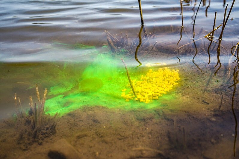 Láhev tekutiny fluorescenční 150 mililitrů krému značky Pro Elite Baits příchuť Banán jahoda na Barva zelená, zejména pro lov kaprů.