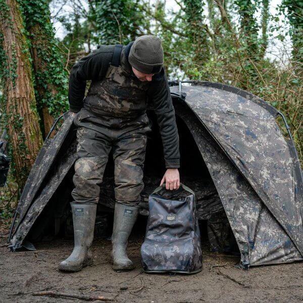 Bagrová taška na brodivý a značkový boty Nash v Barva Camo, zvláštní pro rybolov kaprů.