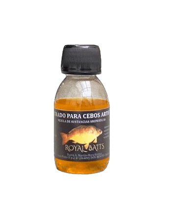 Sklenice koncentrované tekutiny značky Royal Baits s příchutí broskve a ananasu, ideální pro lov kaprů.