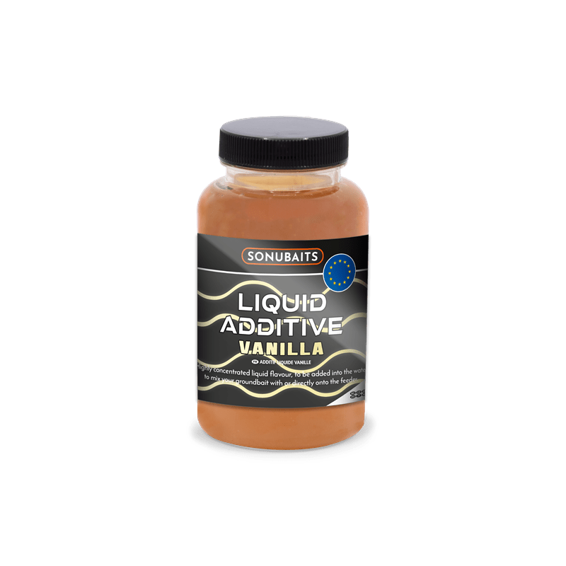 Tekutá značková přísada Sonubaits, příchuť Vanilka, speciální pro použití s kaprařskými nástrahami.