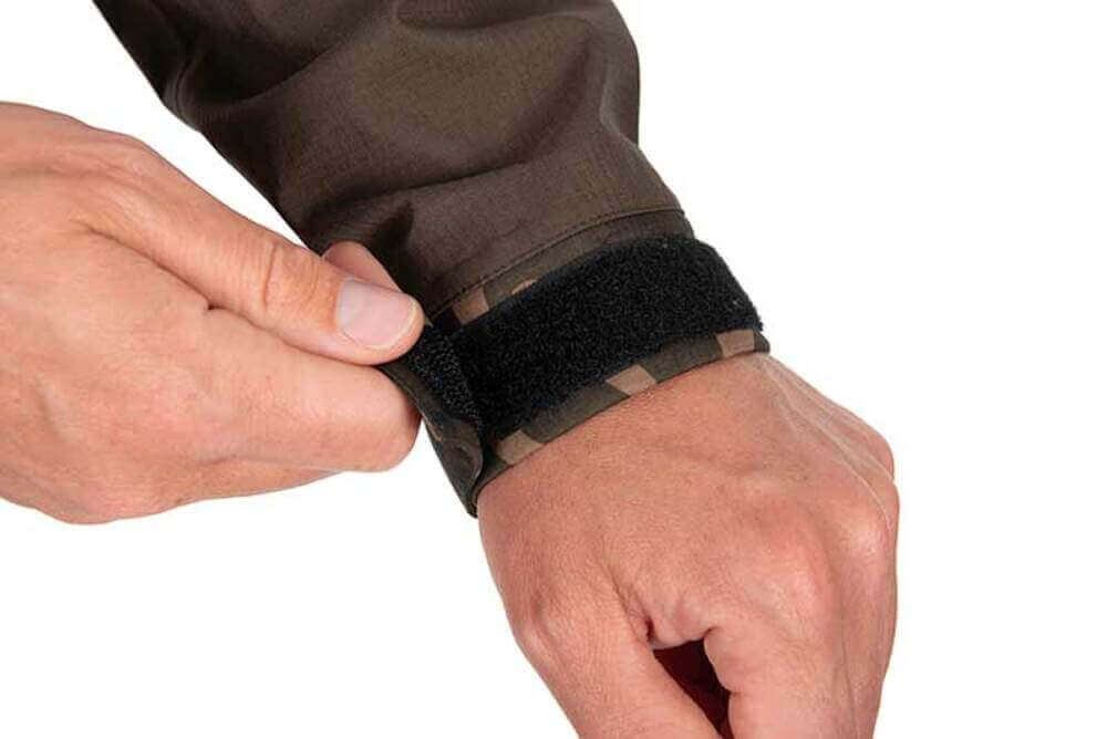 Nepromokavá bunda s kapucí značky Fox model RS 10 K s konstrukcí kamufláž v barvě khakispeciální pro lov kaprů.