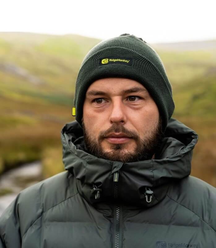 Vysoce kvalitní zimní čepice s kuličkou od značky Ridge Monkey v barvě zelenáspeciální pro lov kaprů.