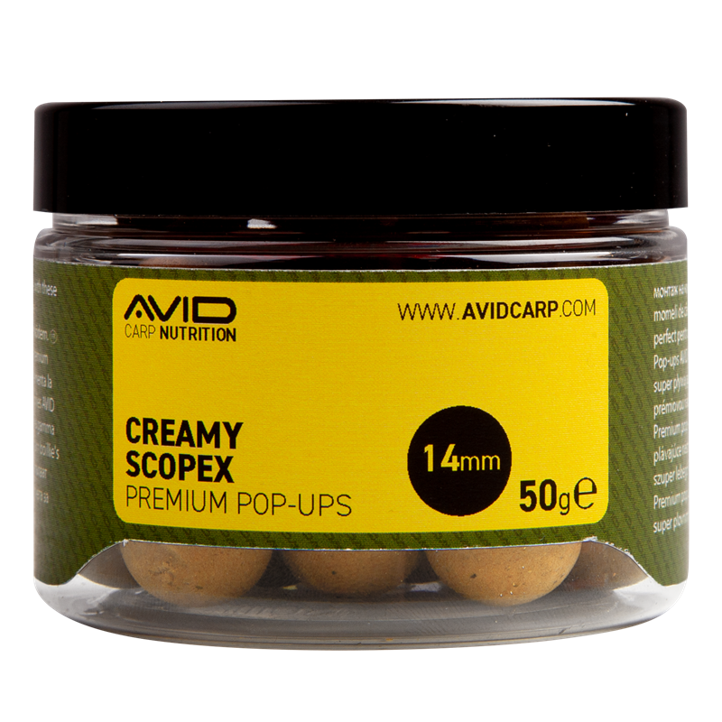 Pop Ups Značkové plováky Avid Carp, řada Premium, příchuť Krémový Scopexspeciální pro lov kaprů.
